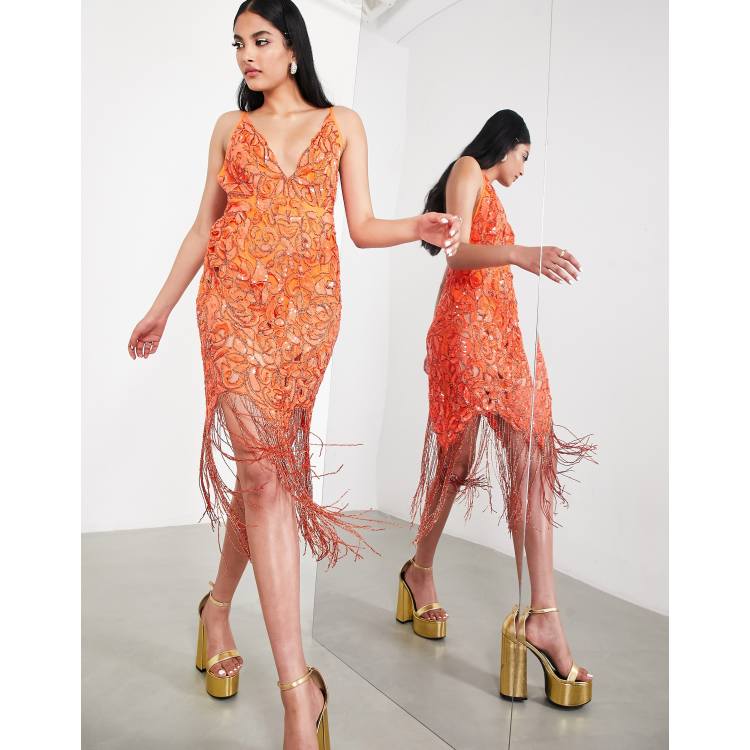 ASOS EDITION sequin cutwork cami midi dress with fringe hot orange Very well made.